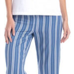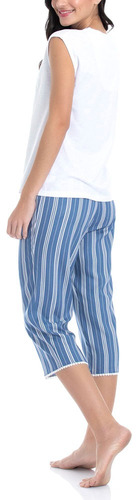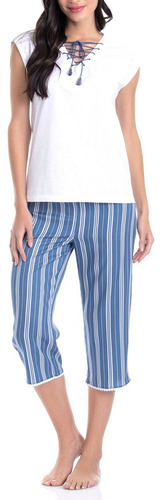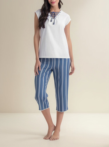 Nuestro pijama de algodón de 2 piezas tiene un lindo detalle en su cuello con abertura en V entrelazado por cordones. El pantalón es capri y viene ajustable con lazo. ¡Ideal para este verano!
